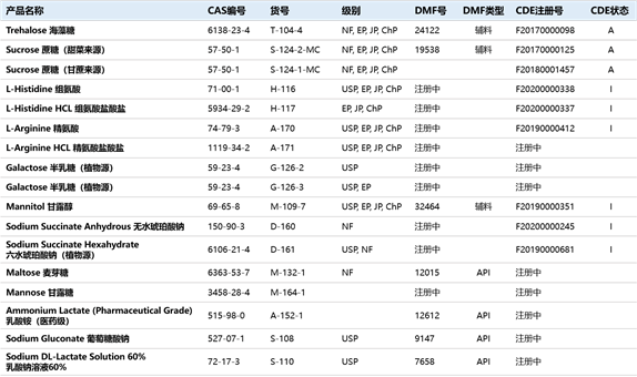 Pfanstiehl高純度低內毒素注射用糖類及氨基酸等十余種輔料產品。Pfanstiehl成立已有百余年歷史,專注于注射用輔料研發(fā)和生產,產品包括海藻糖、蔗糖、甘露醇、精氨酸、精氨酸鹽酸鹽、組氨酸、組氨酸鹽酸鹽等。Pfanstiehl所有產品支持CDE登記注冊,并且海藻糖和蔗糖已經處于激活狀態(tài);