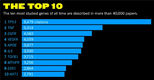 科學(xué)家們在癌癥領(lǐng)域做了大量的研究,目前的主要策略是降解突變體p53,或者改造突變體p53的蛋白折疊,使其恢復(fù)野生型p53的構(gòu)象和功能。在藥物研發(fā)上,想要抑制一個(gè)蛋白的功能容易,想恢復(fù)一個(gè)蛋白的功能卻很難,所以,到目前為止仍沒(méi)有一款靶向p53的抗癌新藥上市,該領(lǐng)域藥物開發(fā)已成為人們最關(guān)注的靶點(diǎn)之一,在Nature雜志2017年的一項(xiàng)統(tǒng)計(jì)中,TP53基因以絕對(duì)優(yōu)勢(shì)位列過(guò)去幾十年最熱門研究基因榜第一名。