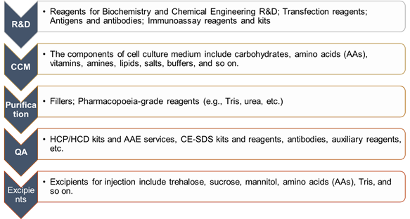 We act as an agent for and sell reagents of a number of well-known international brands, covering multiple fields including cell biology, immunology, botany and pharmaceutical science. Especially in the biomedicine field, we provide reagent and raw/auxiliary material solutions required throughout all links from R&D to production.